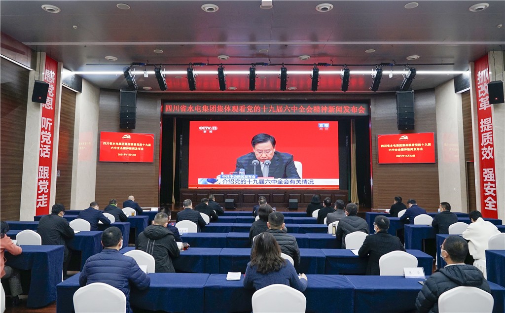 11月12日上午10時,中共中央舉行新聞發布會,介紹黨的十九屆六中全會精神。四川省水電集團黨委把收聽收看黨的十九屆六中全會新聞發布會作為一項重要的政治任務,精心組織、周密部署、廣泛動員,在嚴格落實新冠肺炎疫情防控要求的基礎上,組織廣大干部職工采取線上、線下等多種形式收聽收看新聞發布會實況并開展學習討論,確保將黨的十九屆六中全會精神學習到位、領會到位、貫徹到位。